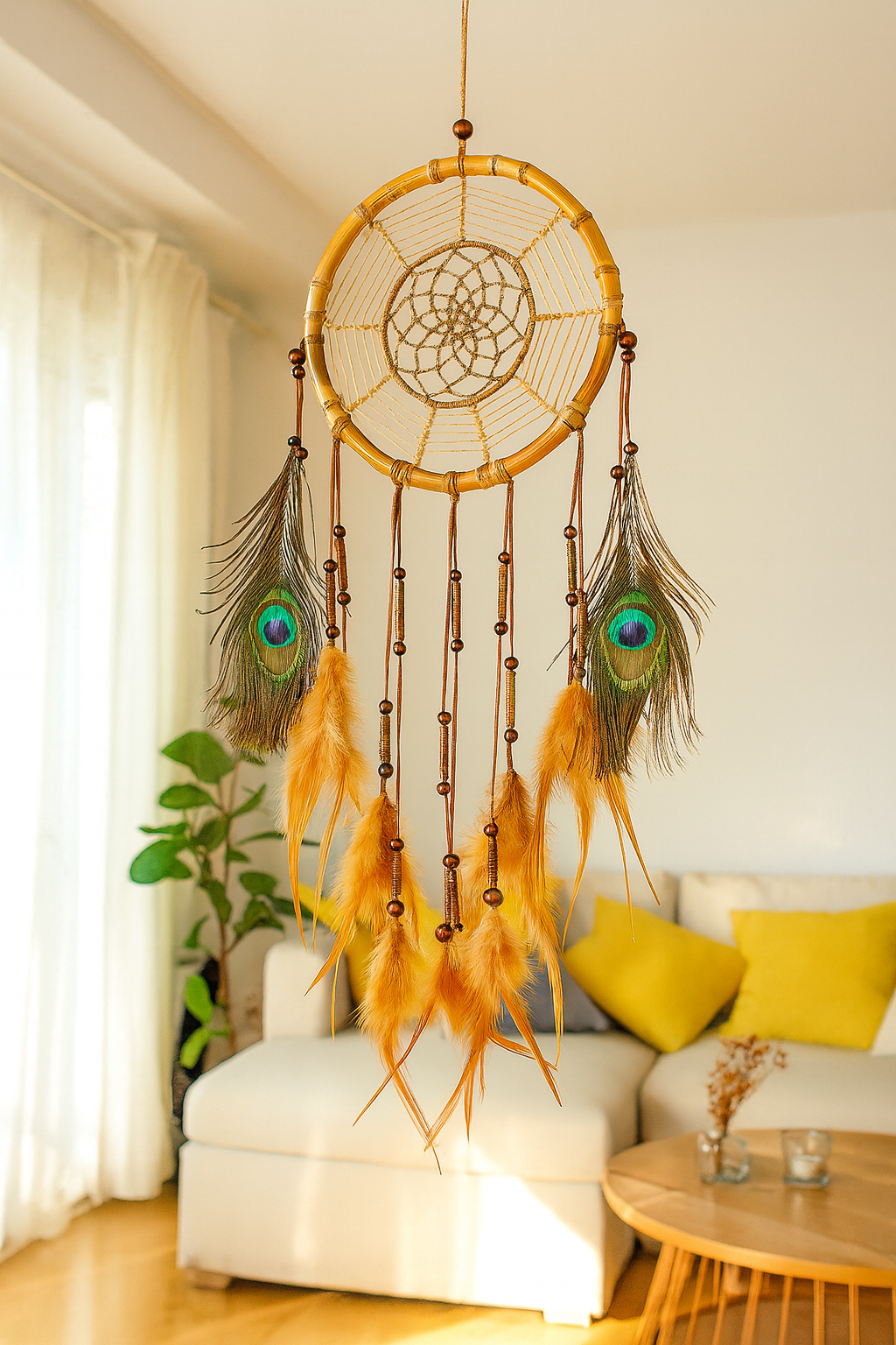 Apportez une touche d’évasion et d’authenticité à votre intérieur avec l’Attrape-Rêves Bohème Naturel, une création artisanale alliant bambou, lin et plumes.