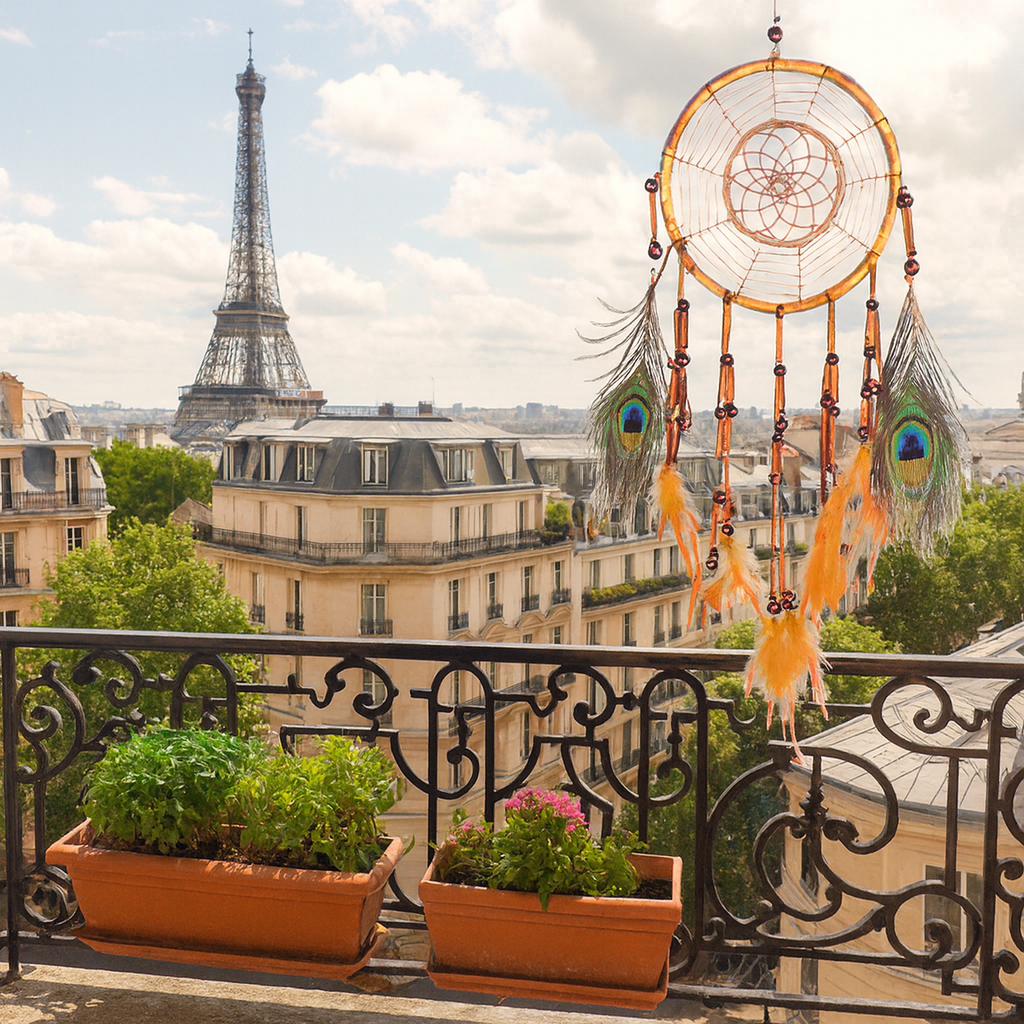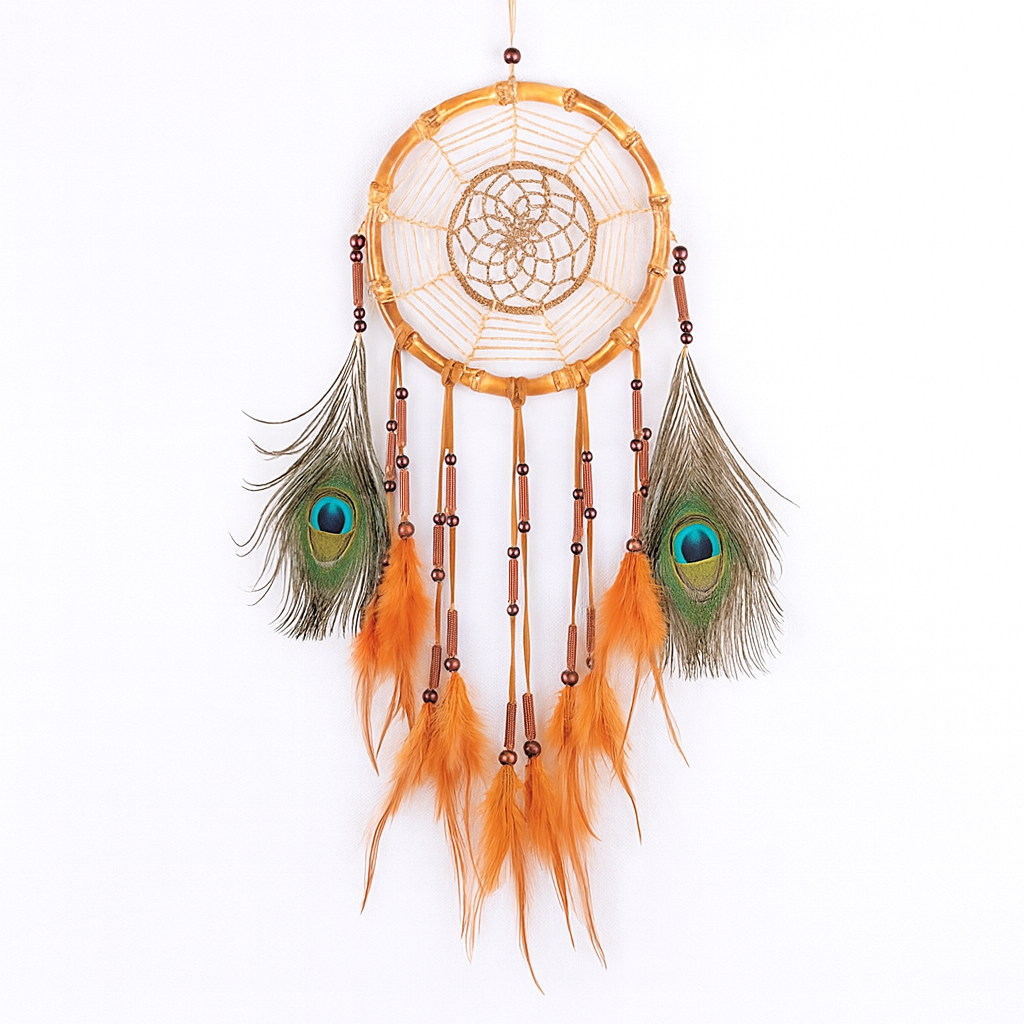 Ses plumes orangées et vert émeraude, rehaussées de perles de bois et de satin, diffusent une énergie chaude et apaisante, transformant votre espace en un véritable havre de paix. Suspendu dans une chambre, un salon ou un bureau, il attire les doux rêves et éloigne les pensées sombres. 🌙