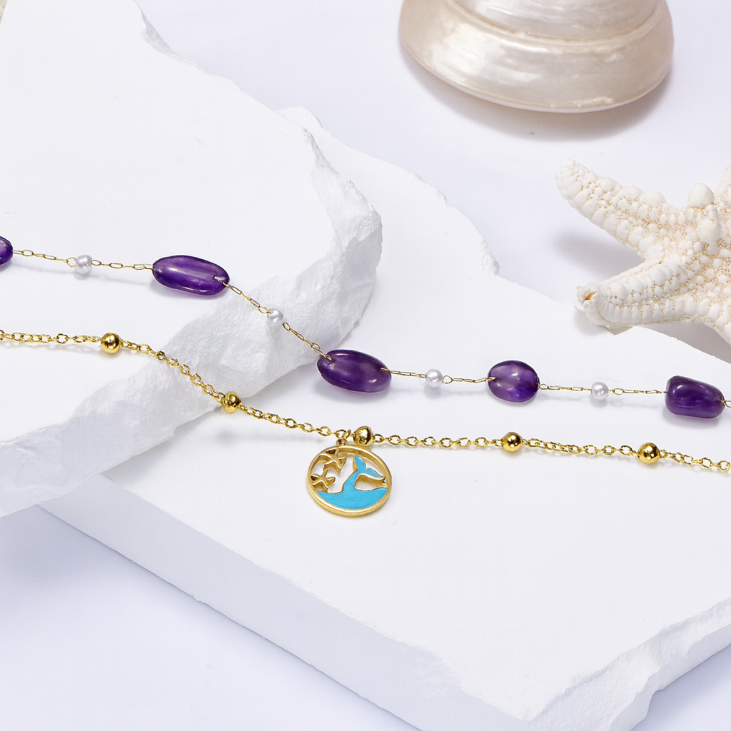 La chaîne de cheville Évasion Améthyste allie l’éclat raffiné de l’acier titane doré à la douceur mystique des pierres naturelles violettes. Chaque maillon, chaque perle, semble raconter une histoire de féminité, de liberté et de charme intemporel.