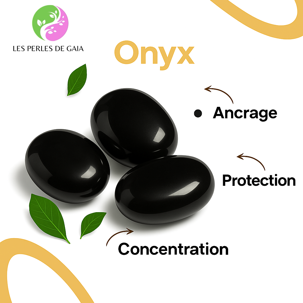 Protection et stabilité (Onyx Noir) : Pierre d’ancrage puissante, elle repousse les énergies négatives, favorise la concentration et renforce l’équilibre émotionnel.