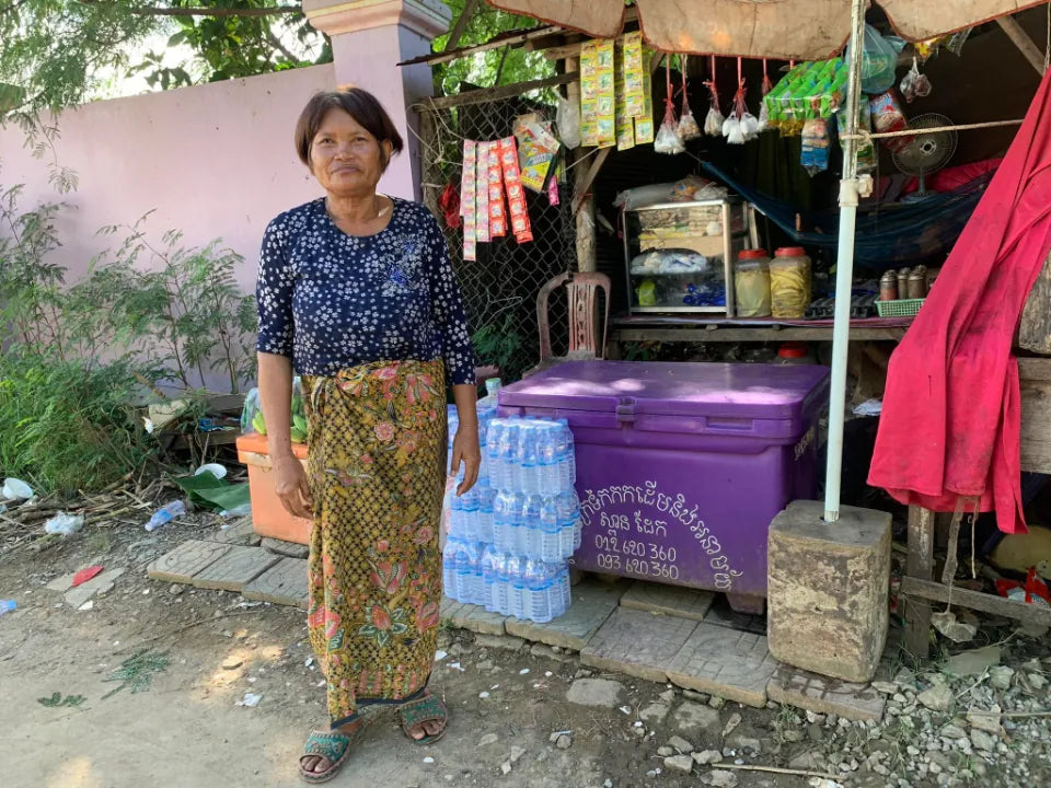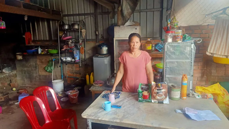 Sokun est veuve. Elle travaille dur pour subvenir aux besoins de ses parents. Chez elle, elle vend du café.